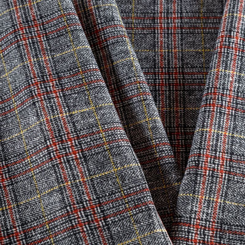 Фактурная и плотная твидовая ткань с добавлением хлопка в красивую и сложную черно-белую клетку, которую освежают тонкие полоски кирпичного и желтого оттенков. Ткань мягкая, пластичная, приятная на ощупь. Хорошо драпируется и образует формоустойчивые складки. Твид отлично подходит для пошива костюмов, пальто, пиджаков, брюк и курток, юбок, жилетов, головных уборов в классическом стиле.