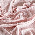 Отличительная особенность этой ткани в полотняном плетении нитей, характерного для рогожки, олицетворяющая сложную "клетчатую" геометрию в розово-молочных оттенках. Различная толщина нитей создает эффектную фактуру. Ткань достаточно формоустойчивая, при этом пластичная, гибкая за счет плетения,  матовая, мягкая, приятная на ощупь, не рыхлая. Прекрасно подойдет для пошива жакета, юбки в виде трапеции, легкого пальто, костюма.
