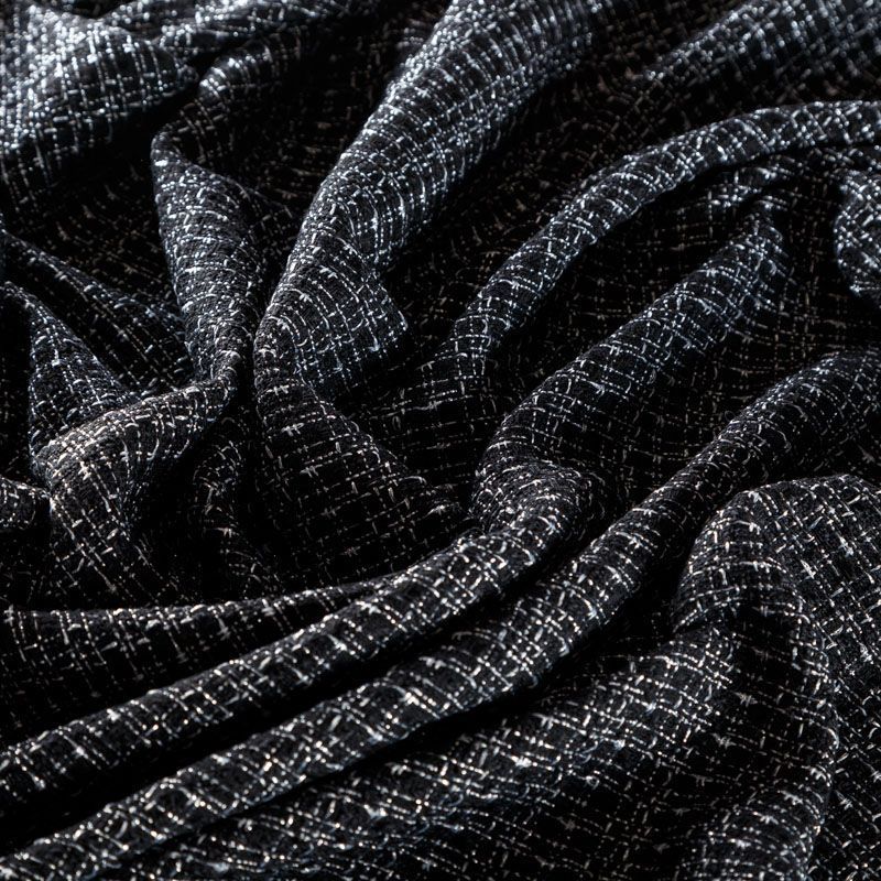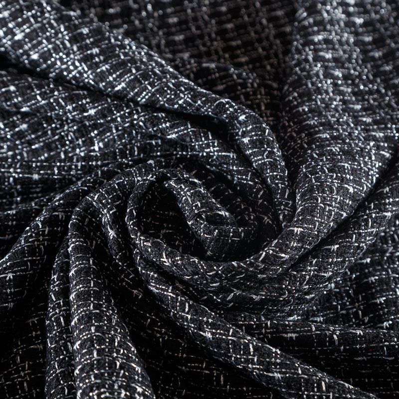 Мягкая, пластичная и объемная ткань, с разреженной и рельефной вывязанной структурой. Буклированный твид в стиле Шанель буквально соткан из различных по толщине и текстуре нитей, образующих рисунок в виде клетки. В плетение добавлена блестящая люрексная нить. Твид идеально подходит для пошива платьев, юбок, жакетов, легких пальто, эффектных бомберов и курток.