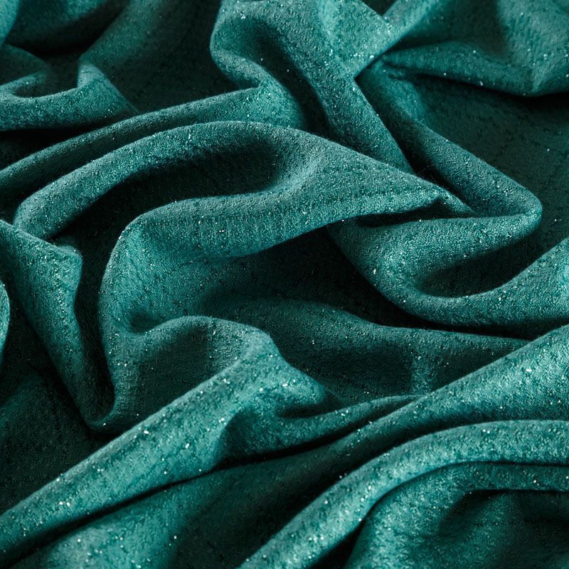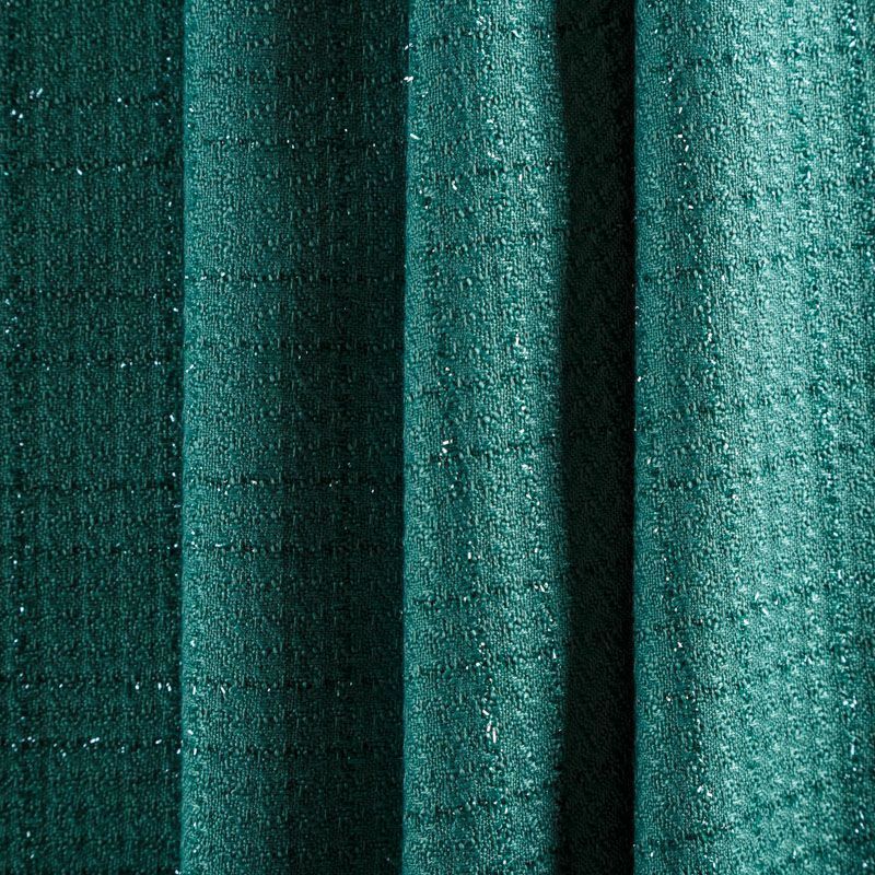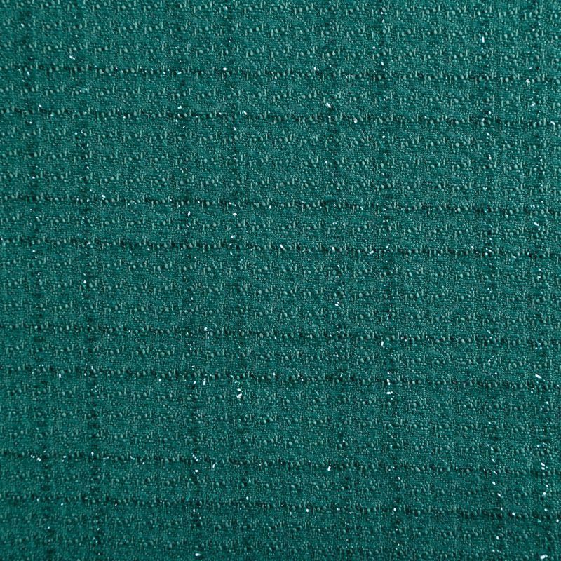 Твид средней плотности с рельефной поверхностью зеленого оттенка с добавлением акцента в виде люрексовой нити, которая имитирует клетку и добавляет ткани нарядности. Твид пластичный, хорошо драпируется, умеренно держит форму, прекрасно подойдет для пошива жакетов на подкладе, жилетов, кардиганов, легких пальто, юбок и платьев.