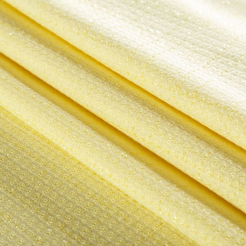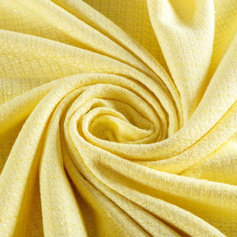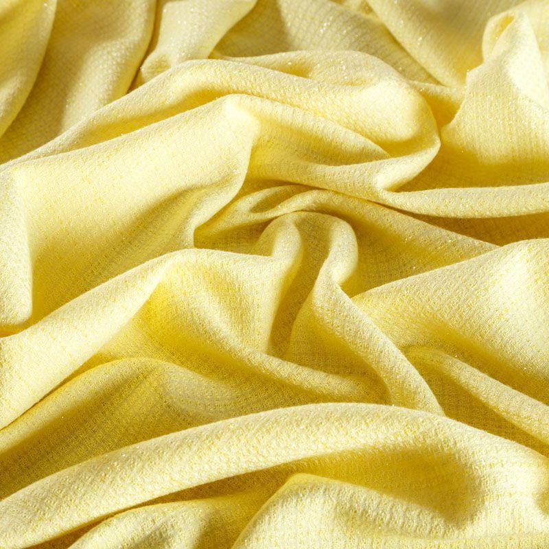 Твид средней плотности с рельефной поверхностью светло-желтого оттенка с добавлением акцента в виде люрексовой нити, которая имитирует клетку и добавляет ткани нарядности. Твид пластичный, хорошо драпируется, умеренно держит форму, прекрасно подойдет для пошива жакетов на подкладе, жилетов, кардиганов, легких пальто, юбок и платьев.