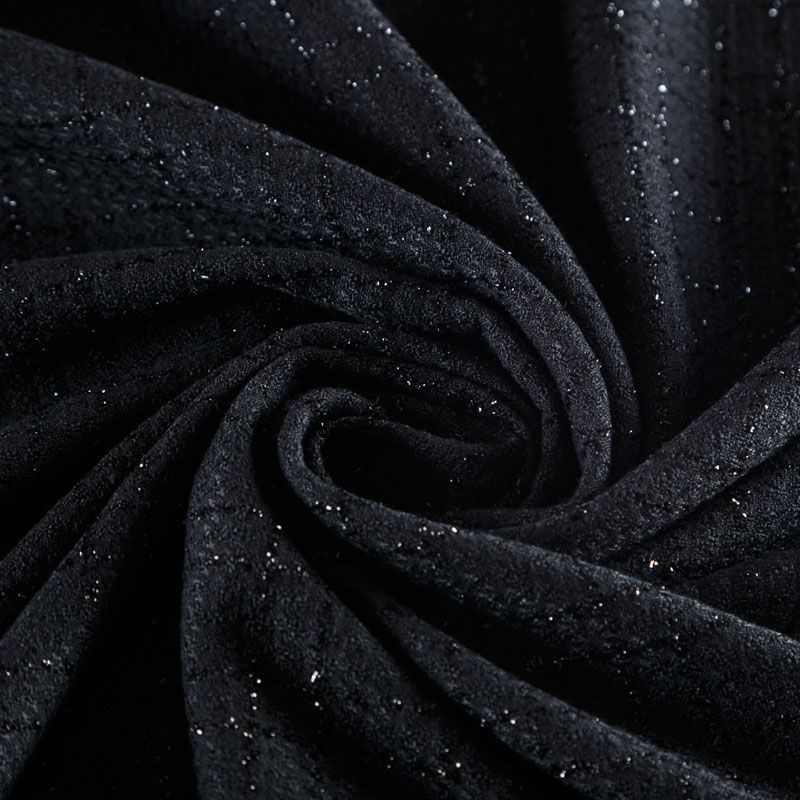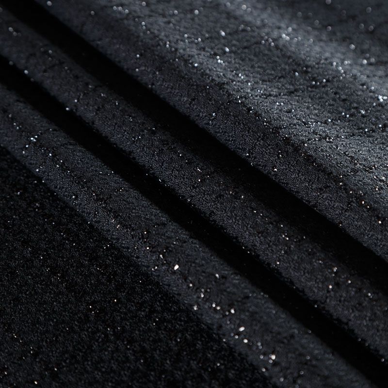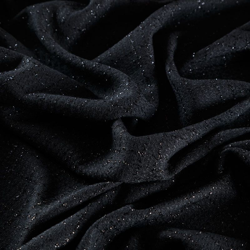 Твид средней плотности с рельефной поверхностью черного цвета с добавлением акцента в виде люрексовой нити, которая имитирует клетку и добавляет ткани нарядности. Твид пластичный, хорошо драпируется, умеренно держит форму, прекрасно подойдет для пошива жакетов на подкладе, жилетов, кардиганов, легких пальто, юбок и платьев.