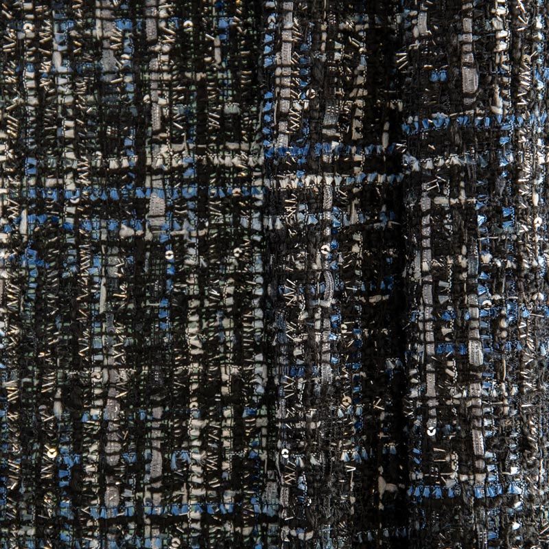 Мягкая ткань с рельефной вывязанной структурой. Буклированный твид в стиле Шанель буквально соткан из толстых цветных нитей, образующих рисунок в виде клетки. В плетение добавлены тесемки, люрексная нить, волокна, а также мелкие серебристые пайетки. Твид идеально подходит для пошива юбок, жакетов и пальто в стиле Шанель.