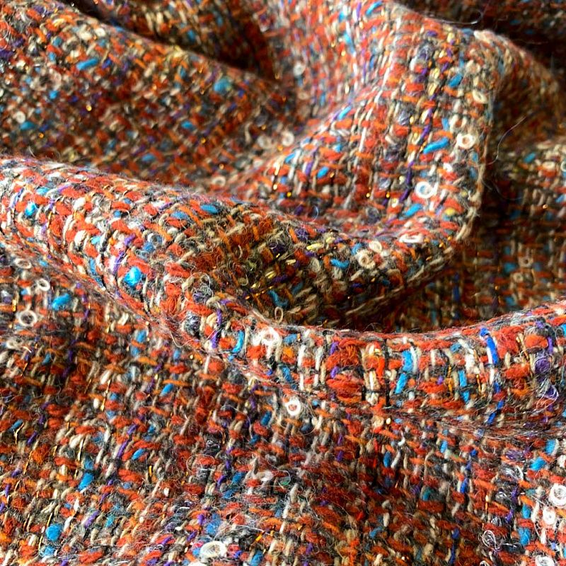 Переплетение разноцветных нитей делает эту ткань универсальной, и в тоже время оригинальной. Полотно плотное, но очень мягкое. Теплое, комфортное. Плетение рыхлое, поверхность фактурная, поэтому изделия выглядят достаточно объемно. Подойдет для пошива костюмов с юбкой, жакетов, облегченных пальто.