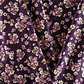 Плотная и мягкая ткань темно-сливового оттенка с ярким мелкоцветом, имеет саржевое плетение и характерный диагональный рубчик на поверхности. Отлично сохраняет форму, не сильно мнется и не деформируется в процессе эксплуатации. Красиво ложится в складки, поэтому прекрасно подойдет на длинные драпированные юбки и платья, на свободные брюки или шорты, топы.