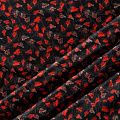 Плотная и мягкая ткань черного цвета с ярким мелкоцветом, имеет саржевое плетение и характерный диагональный рубчик на поверхности. Отлично сохраняет форму, не сильно мнется и не деформируется в процессе эксплуатации. Красиво ложится в складки, поэтому прекрасно подойдет на длинные драпированные юбки и платья, на свободные брюки или шорты, топы.