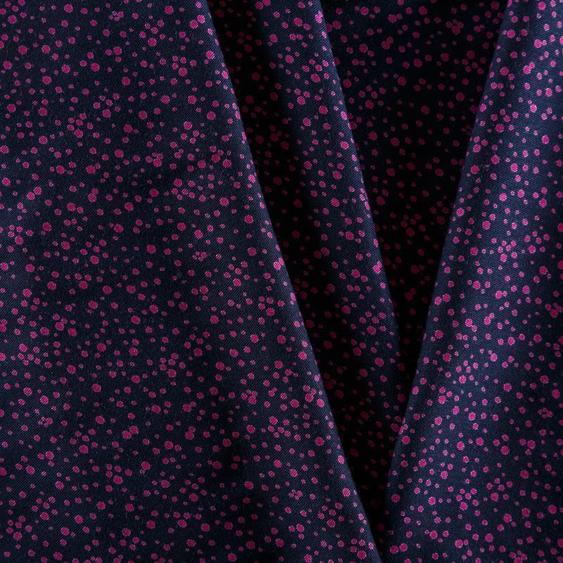Плотная и мягкая ткань фиолетово-синего оттенка с хаотичным мелким принтом цвета фуксии, имеет саржевое плетение и характерный диагональный рубчик на поверхности. Отлично сохраняет форму, не сильно мнется и не деформируется в процессе эксплуатации. Красиво ложится в складки, поэтому прекрасно подойдет на длинные драпированные юбки и платья, на свободные брюки или шорты, топы.