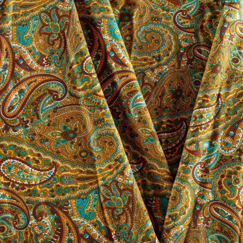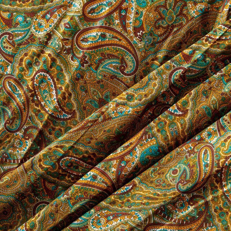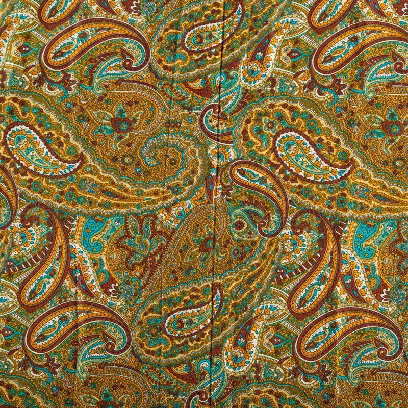 Плотная и мягкая ткань шоколадного оттенка с богатым узором пейсли в желто-зеленых тонах, имеет саржевое плетение и характерный диагональный рубчик на поверхности. Отлично сохраняет форму, не сильно мнется и не деформируется в процессе эксплуатации. Красиво ложится в складки, поэтому прекрасно подойдет на длинные драпированные юбки и платья, на свободные брюки или шорты, топы, комбинезоны, а также для домашней одежды.