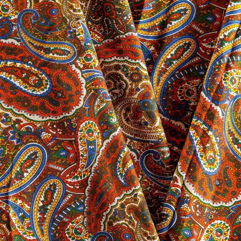 Плотная и мягкая ткань бежевого оттенка с богатым узором пейсли в желто-коричневых тонах, имеет саржевое плетение и характерный диагональный рубчик на поверхности. Отлично сохраняет форму, не сильно мнется и не деформируется в процессе эксплуатации. Красиво ложится в складки, поэтому прекрасно подойдет на длинные драпированные юбки и платья, на свободные брюки или шорты, топы, комбинезоны, а также для домашней одежды.