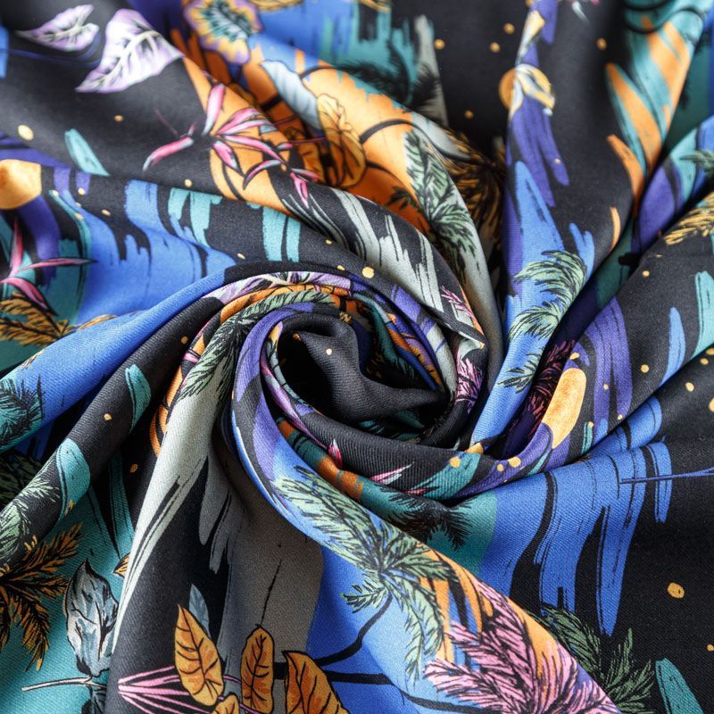 Плотная и мягкая ткань, имеет саржевое плетение и характерный диагональный рубчик на поверхности. Отлично сохраняет форму, не сильно мнется и не деформируется в процессе эксплуатации.  Красиво ложится в складки, поэтому прекрасно подойдет на длинные драпированные юбки и платья, на свободные брюки или шорты, блузки, рубашки или топы.