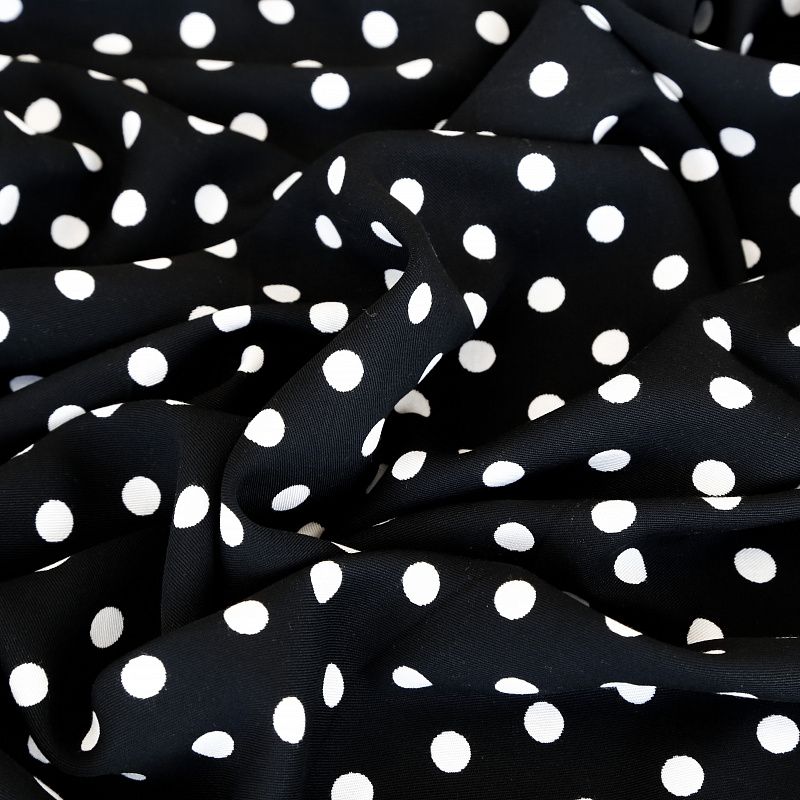 Плотная и мягкая ткань, имеет саржеве плетение и характерный диагональный рубчик на поверхности. Отлично сохраняет форму, не сильно мнется и не деформируется в процессе эксплуатации. Красиво ложиться в складки, поэтому прекрасно подойдет на длинные драпированные юбки и платья, на свободные брюки или шорты, топы. Размер гороха 1см