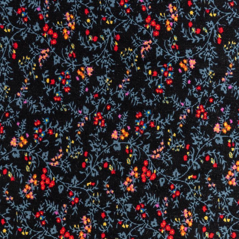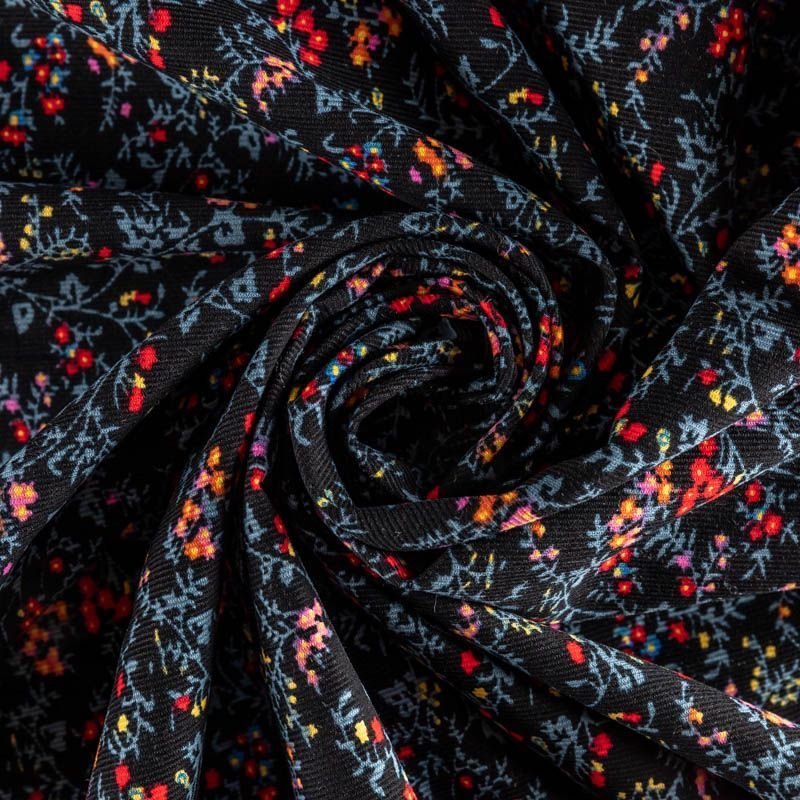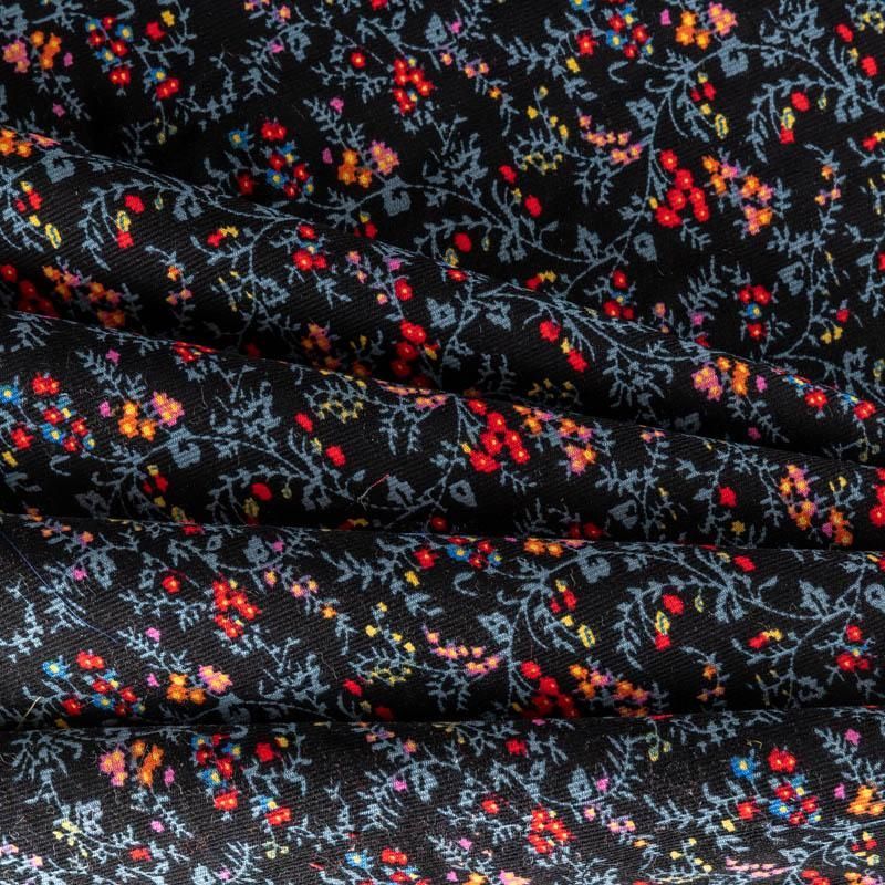 Костюмно-плательный вельвет из хлопка в черном цвете с флористическим принтом. Очень приятный тактильно, поверхность бархатистая в тонкий рубчик, не тянется, не просвечивает. Подойдет для пошива костюма, жакета, платья, сарафана, юбки или брюк.