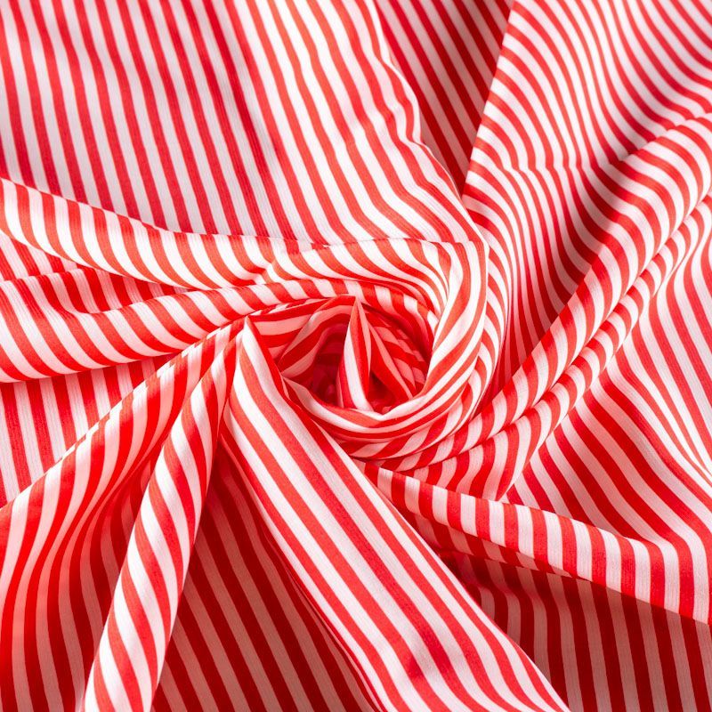 Плательно-рубашечная итальянская вискоза с принтом в горизонтальную полоску красного цвета. Натуральная, дышащая ткань, очень приятная к телу, отлично драпируется, струится, не просвечивает. Хорошо подойдет для пошива платьев, рубашек, платьев-рубашек, блуз, юбок, брюк, летних костюмов, пыльников, детской одежды.
