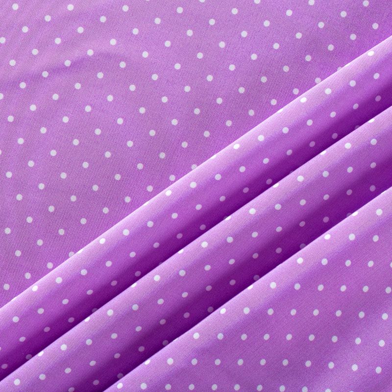 Плательно-рубашечная итальянская вискоза цвета аметиста с принтом в мелкий горошек. Натуральная, дышащая ткань, очень приятная к телу, отлично драпируется, струится, не просвечивает. Хорошо подойдет для пошива платьев, рубашек, платьев-рубашек, блуз, юбок, брюк, летних костюмов, пыльников, детской одежды.
