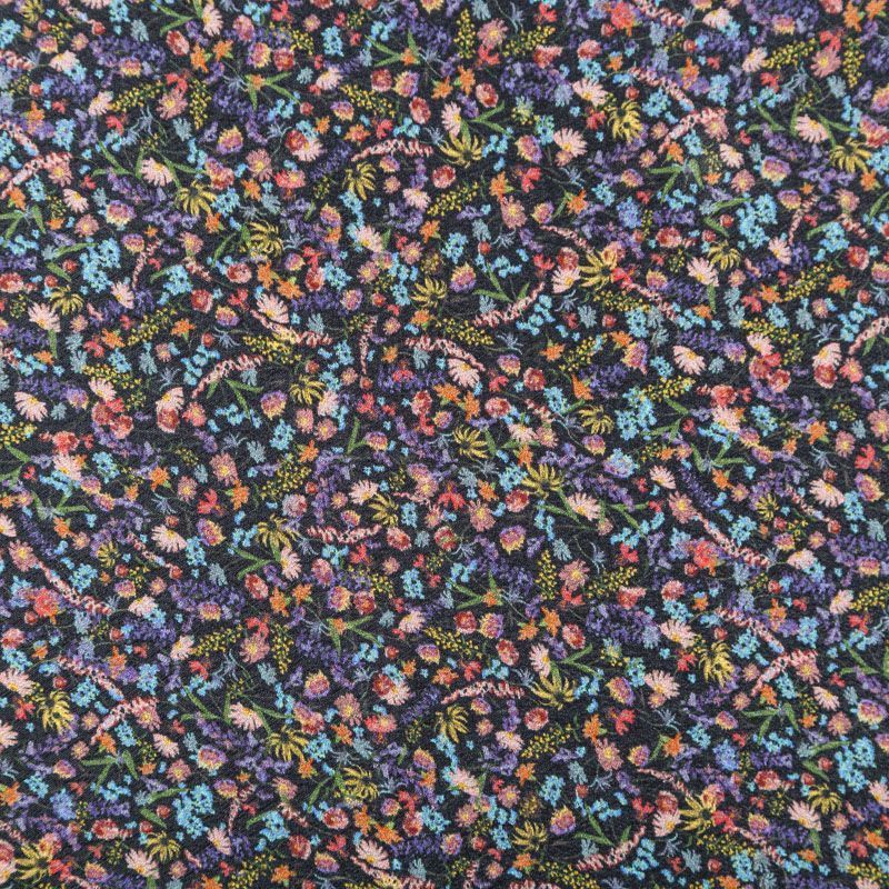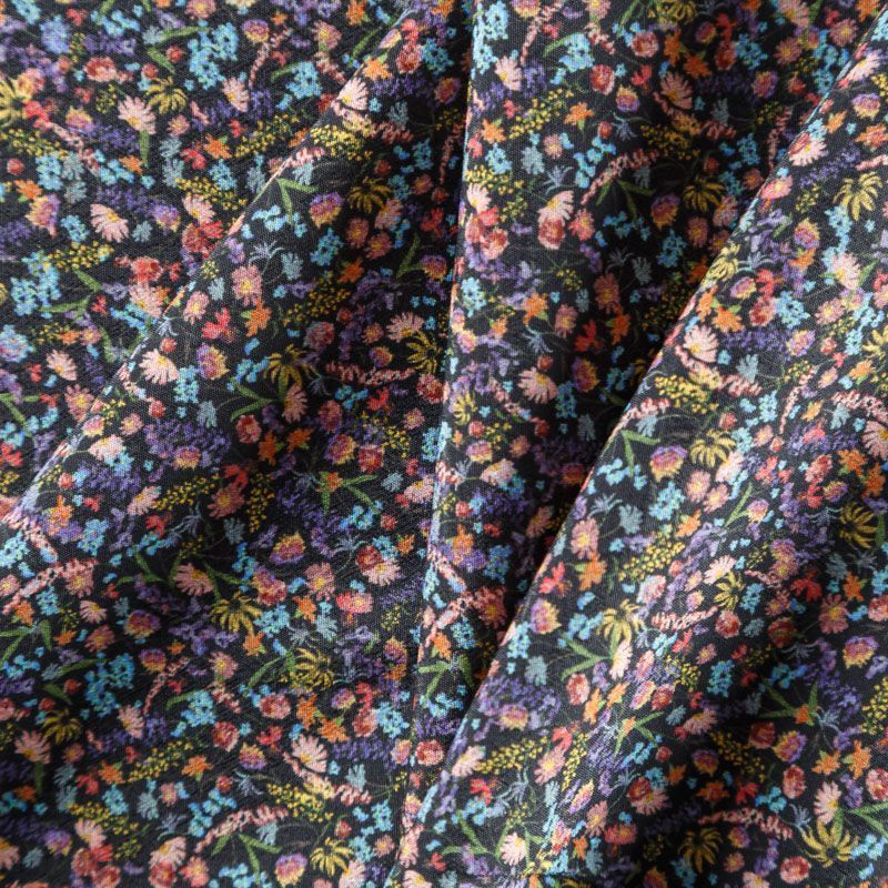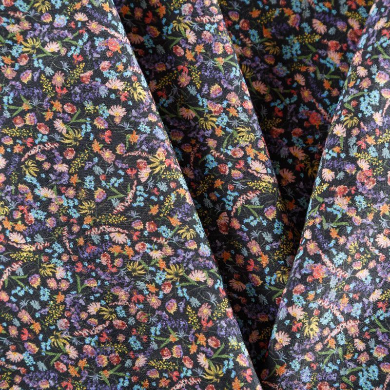 Итальянская вискоза черного оттенка с популярным ярким мелкоцветом. Ткань тонкая, но не просвечивает, отлично драпируется и струится, приятная на ощупь. Прекрасно подойдет для пошива платья, сарафана, топа, блузки, юбки, пижамного костюма.