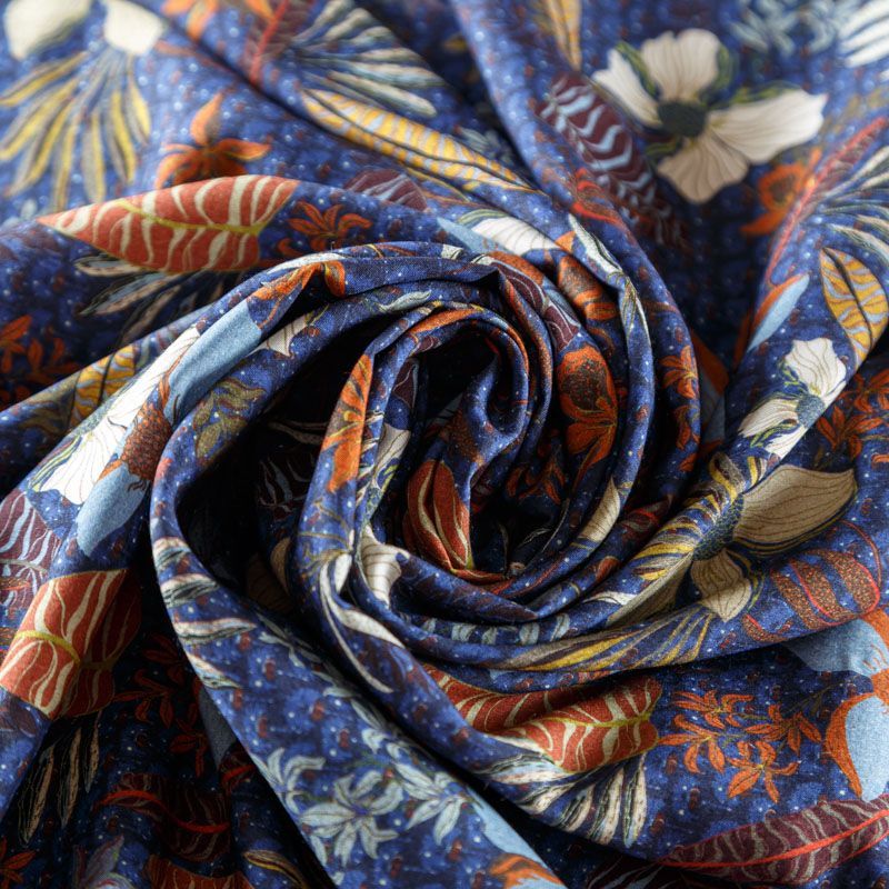 Итальянская плательно-блузочная вискоза со стилизованным цветочным принтом на темно-синем фоне. Ткань очень пластичная, отлично драпируется и струится, мягкая и приятная на ощупь, не просвечивает. Прекрасно подойдет для пошива платья, рубашки, топа, блузки, юбки, летнего костюма.