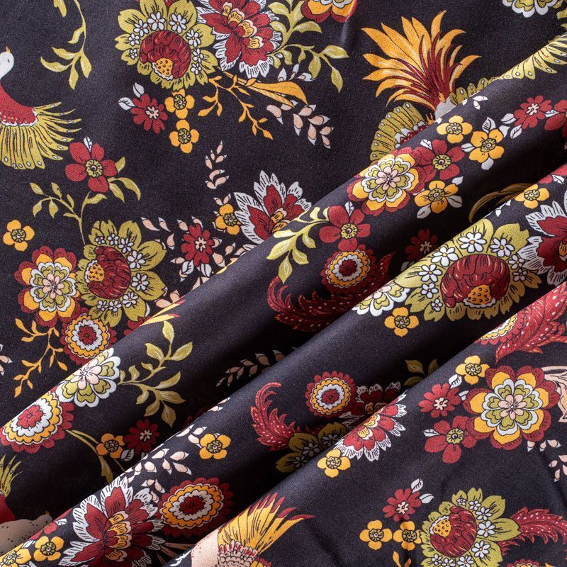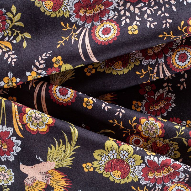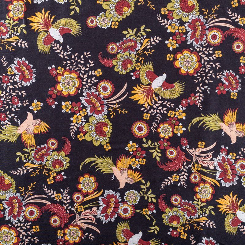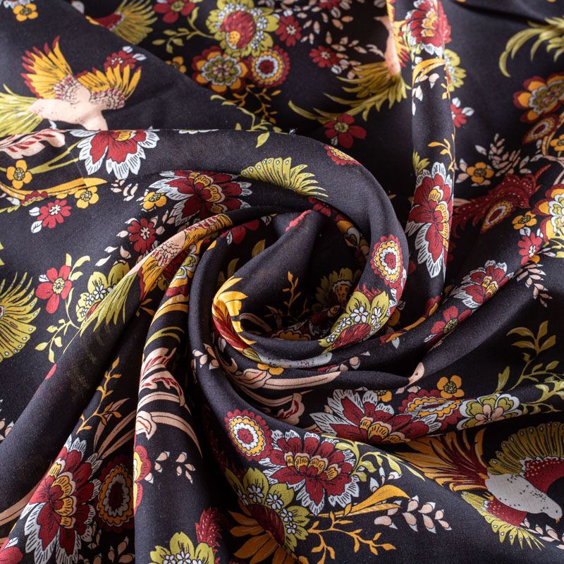 Итальянская плательно-блузочная вискоза с ярким фантазийным цветочным принтом на черном фоне. Ткань очень пластичная, отлично драпируется и струится, мягкая и приятная на ощупь, не просвечивает. Прекрасно подойдет для пошива платья, топа, блузки, юбки.
