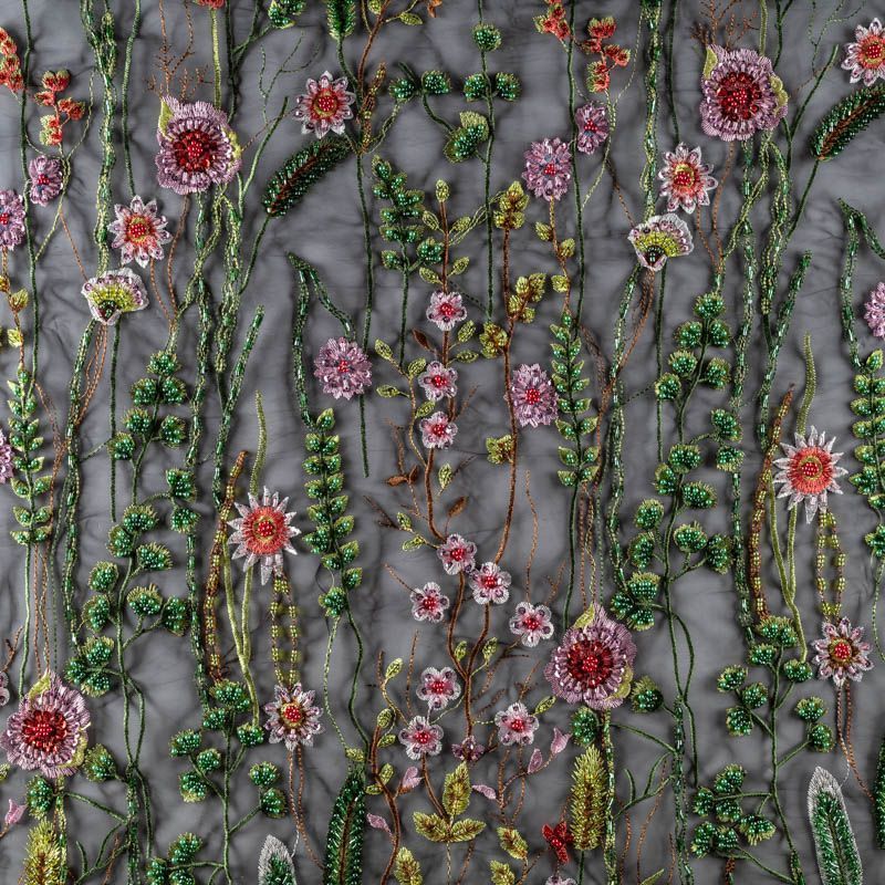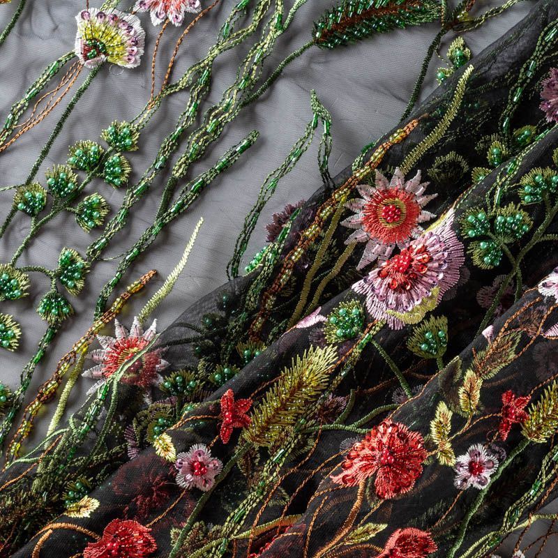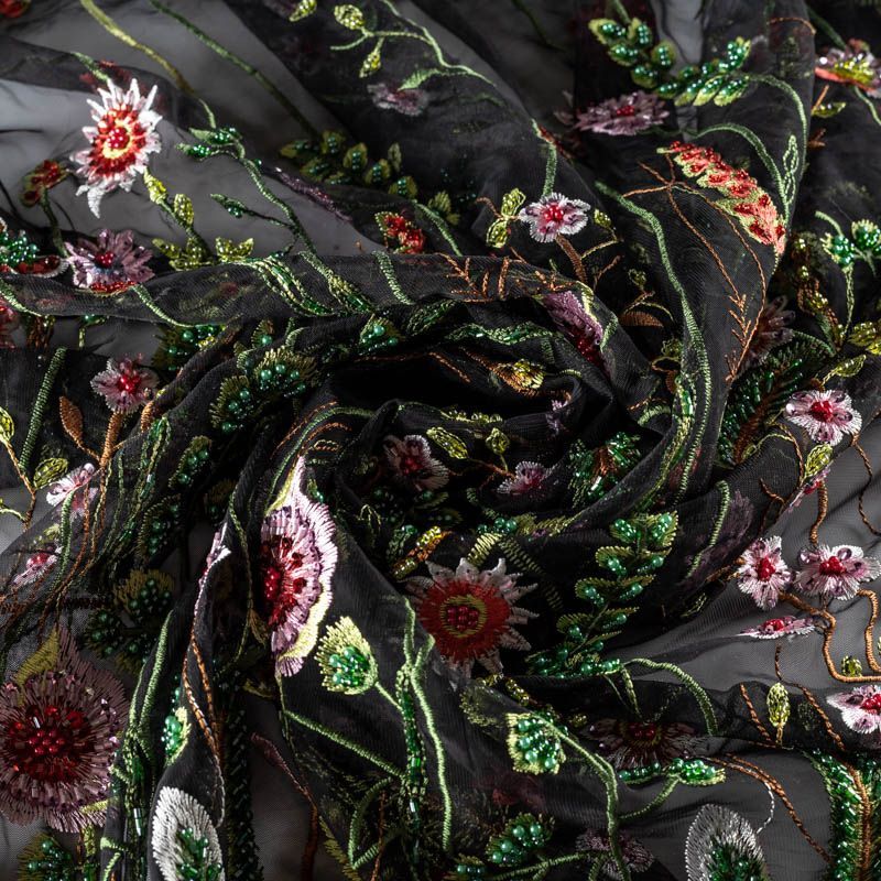 Итальянское полотно черного цвета с флористическим узором, расшитым бисером и стеклярусом. Узор вышит на тонкой сетке с мелкой ячейкой, сетка мягкая, пластичная, матовая, не держит форму. Прекрасно подойдет для вечерних платьев, юбок, топов, бюстье. Эффектно смотрится на теле без подкладочной ткани, например, рукава платья. Ткань набирается объемом.
