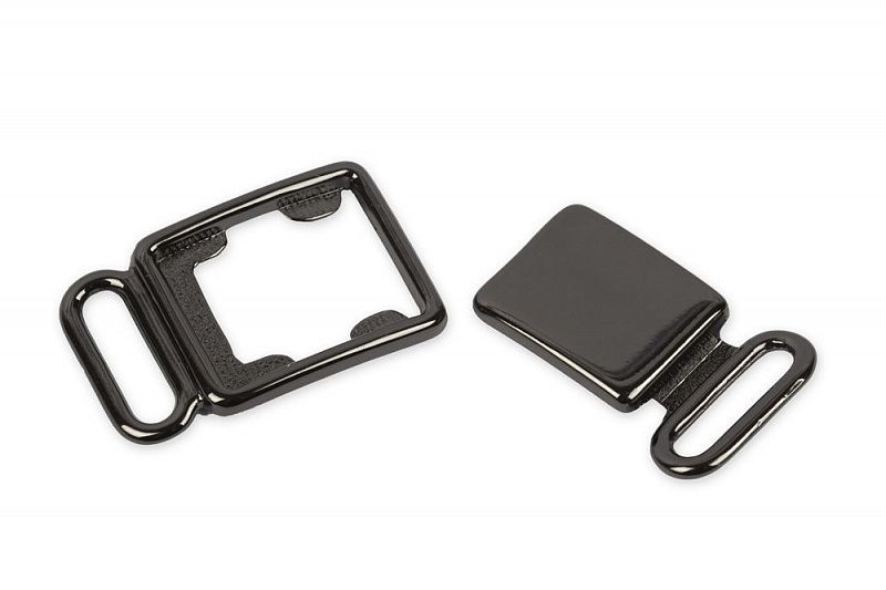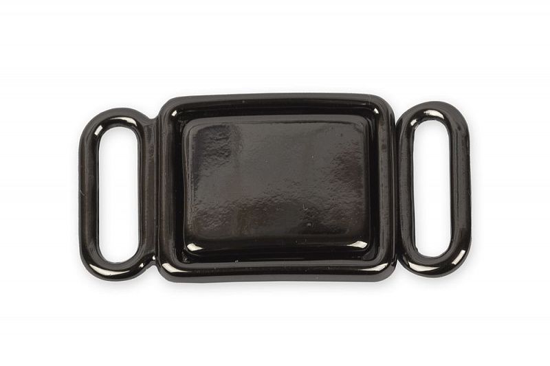 Декоративная металлическая застёжка состоит из 2-х частей, которые при закрывании образуют прямоугольник. Для застёгивания детали вставляются одна в другую. Имеются отверстия для фиксации застёжки на изделии лентой шириной 10 мм. Используется для соединения деталей, а также украшения женского нижнего белья, купальников, одежды, сумок и т.д. Изготовлена из качественного сплава металлов, имеет блестящую поверхность, покрыта защитным слоем, который дает возможность изделию не ржаветь. При значительном повреждении защитного слоя ржавение возможно.