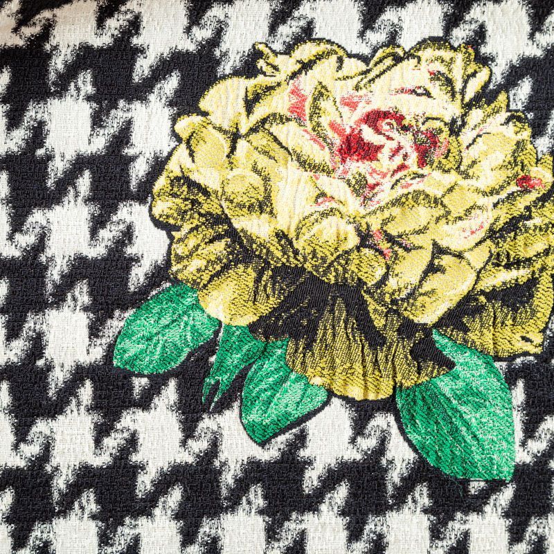 Итальянский хлопковый жаккард в крупную "гусиную лапку", дополненную акцентными разноцветными пионами. Ткань очень стильная, сложно-фактурная, рельефная, тянется за счет эластана в составе. Подходит для пошива костюмов, юбок, платьев, лёгких летних пальто. ВНИМАНИЕ! ОСТАТОК 1,1 и 0,7 м.