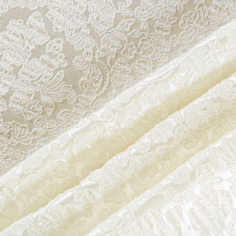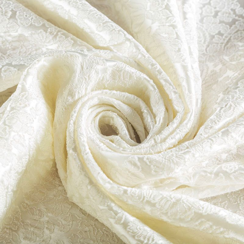 Итальянский жаккард молочного оттенка с изящным цветочным орнаметом. Ткань мягкая и пластичная, держит форму, хорошо драпируется. Повехность фактурная, матовая. Подойдет для создания вечерних  и свадебных платьев, нарядных костюмов, жакетов, юбок, корсетов, шорт.