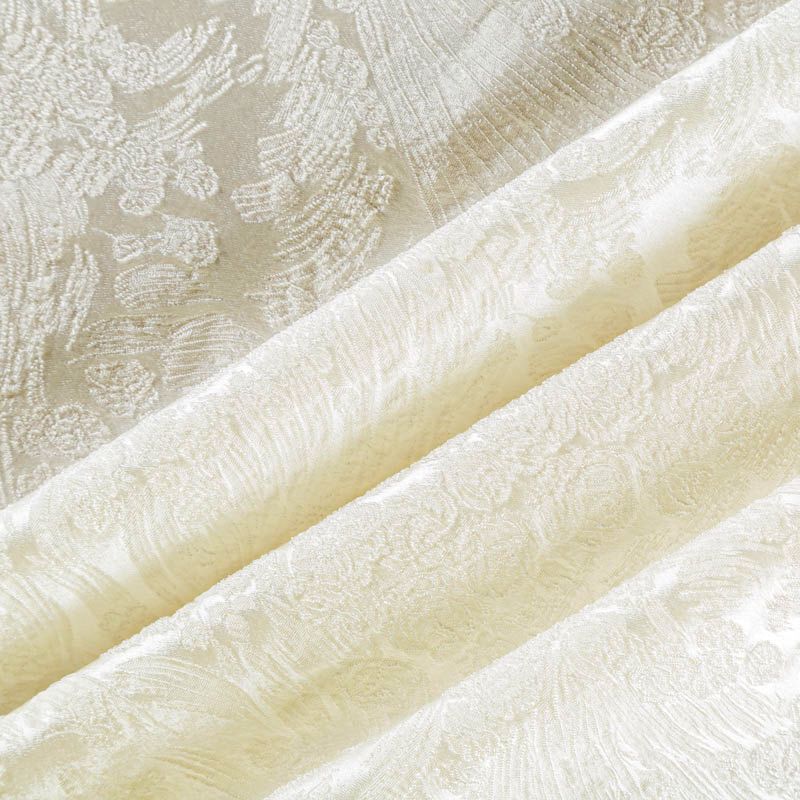Итальянский жаккард с красивым орнаментом оттенка молочного жемчуга. Ткань легкая, но плотная, поверхность со сдержанным блеском, объемная и текстурная, хорошо драпируется и держит форму, тянется за счет эластана в составе, не просвечивает. Подойдет для пошива нарядных вечерних костюмов, корсетов, платьев-футляров, жакетов, топов, легких пальто, бомберов, юбок или шорт.