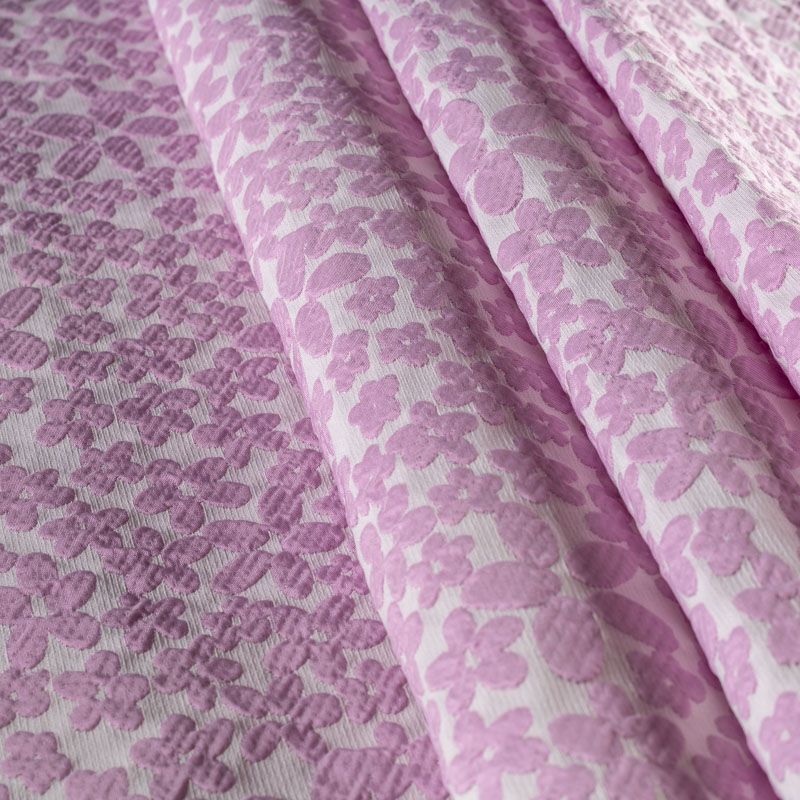 Молочный рельефный фон итальянского жаккарда дополнен узором из объемных разновеликих цветов простой формы нежного розового оттенка. Ткань легкая, средней плотности, не просвечивает, не тянется. Хорошо держит форму и драпируется. Идеально подойдет для платьев различных силуэтов, костюмов, жакетов, юбок, шорт, легких пальто.