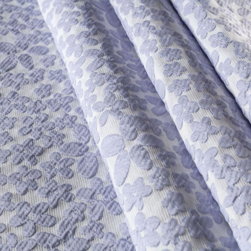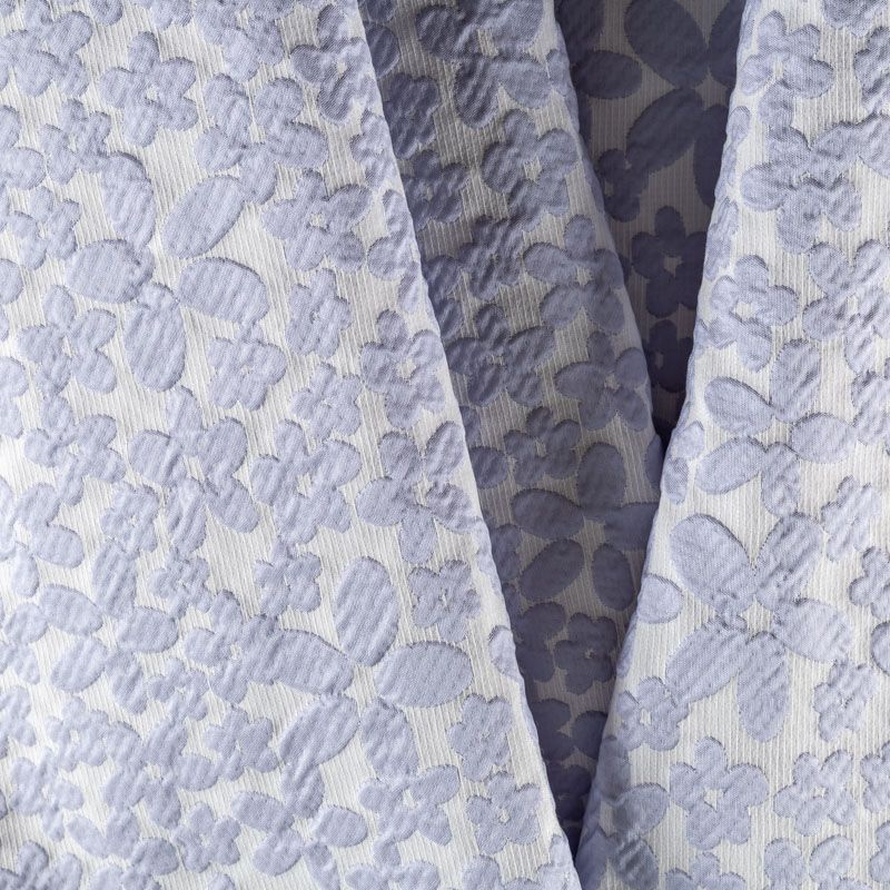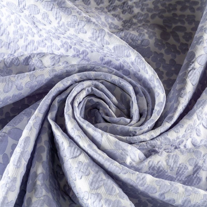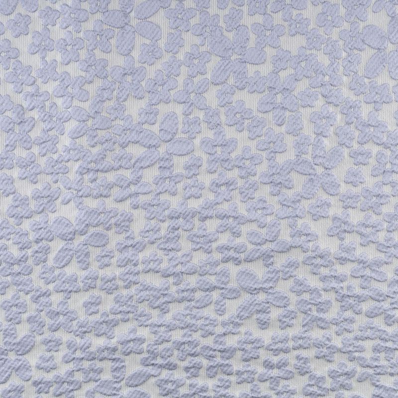 Молочный рельефный фон итальянского жаккарда  дополнен узором из объемных разновеликих цветов простой формы холодного голубого оттенка. Ткань легкая, средней плотности, не просвечивает, не тянется. Хорошо держит форму и драпируется. Идеально подойдет для платьев различных силуэтов, костюмов, жакетов, юбок, шорт, легких пальто.